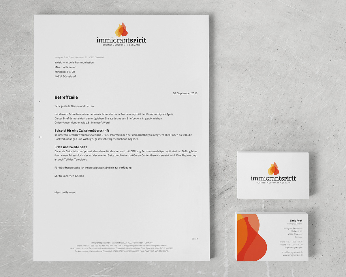 Entwicklung eines Coporate Designs für das durch das Bundesamt für Wirtschaft geförderte StartUp Immigrant Spirit. Der Schriftzug wurde von den Unterlängen befreit, damit eine Eigenständigkeit entsteht und sich die Tagline "Business Culture in Germany" harmonisch unterordnen lässt. Bei der Farbgebung wurde als Basis die deutsche Flagge mit schwarz-rot-gold übernommen und alles vor einen weißen Hintergrund platziert. Bei der Bildmarke haben wir zunächst Symbole wie der Bundesadler oder das Brandenburger Tor integriert, um dann zugunsten einer stärkeren Abstraktion bei der reinen Flammensymbolik zu bleiben. Kunde: Immigrant Spirit Branche: Human Resources