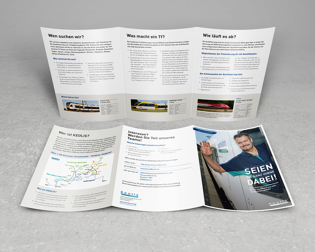 Weiterentwicklung des Corporate Designs für Keolis Deutschland: neben der kommunikativen Begleitung von internen Maßnahmen wie Leitbild- und Ideenmanagement-Kampagnen wurden auch klassiche Medien wie z.B. Folder für das Recruiting von neuen Triebfahrzeugführern in einem modernen Erscheinungsbild umgesetzt. Begleitung des Fotoshootings und ArtDirection der Fotoretusche. Kunde: Keolis Deutschland Branche: Transportation Fotografie: Christian Köster