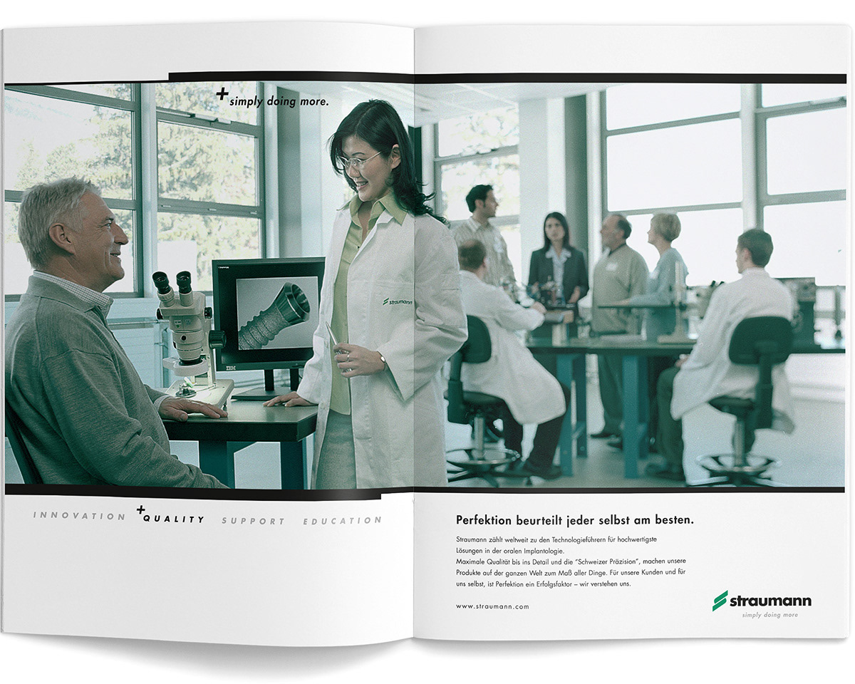 Konzeption & Kreation einer Dachmarkenkampagne für die Straumann AG. Ausarbeitung der Idee, Entwicklung doppelseitiger Anzeigenmotive und Präsentation via Skribbles, Vorzeichnungen und farbiger Illustrationen. Integration in das Anzeigenlayout. Fotoshooting nach Fotokonzept (inkl. Dreh eines Imagefilms). Bildbearbeitung und Druckdatenerstellung. Ausweitung der Idee & Konzeption auf Produktanzeigen und auf zwei Imagebroschüren. Kunde: Straumann Branche: Medizintechnik, Dentalimplantate Agentur: enowa Illustration: Peter Esser Fotografie: Kai Schäfer
